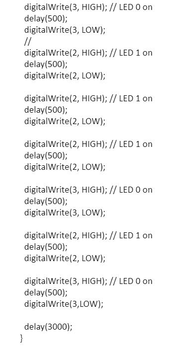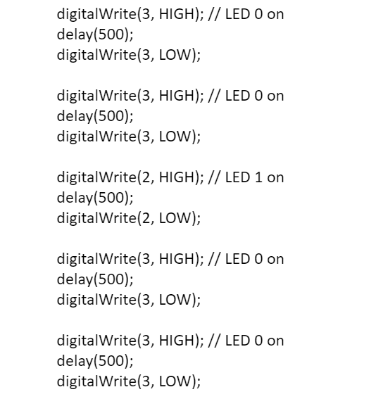 These are some examples of the code we input to get our LEDs to blink out 68 in binary. I also learned an efficient way of calculating the binary of any number by dividing it by 2 repeatedly until you get to zero and the quotient from each displayed backwards gave you the binary number.